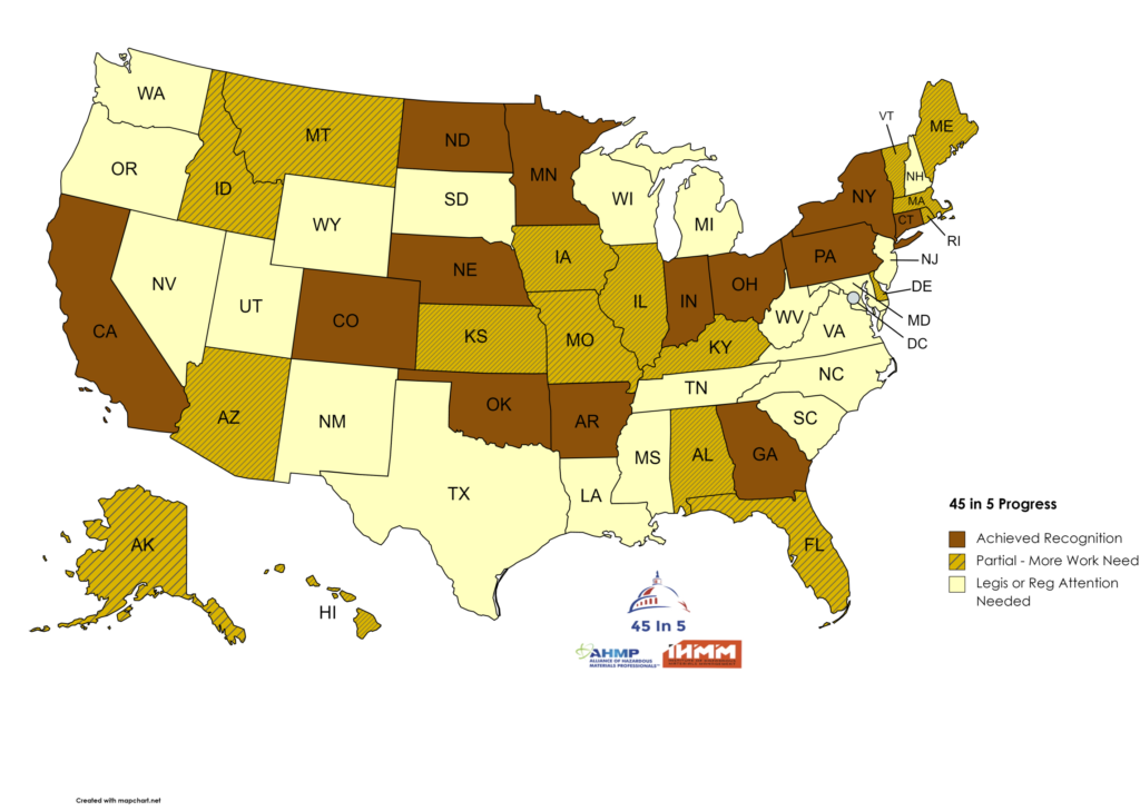 - We have already succeeded in 13 states – New York, Connecticut, Pennsylvania, Indiana, California, Colorado, Nebraska, Minnesota, Arkansas, Oklahoma. Ohio, North Dakota, and Georgia. [Red states in the map above]. These are states where IHMM credentials are cited or 40 CFR 312.10 is cited by reference.