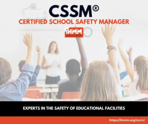 IHMM’s Certified School Safety Manager® [CSSM®] credential certifies the school safety professional who is responsible for overseeing and supporting key operational and safety functions in educational facilities. This position may provide direct supervision or advise operations and academic programs in order to provide an environment free of recognized hazards.