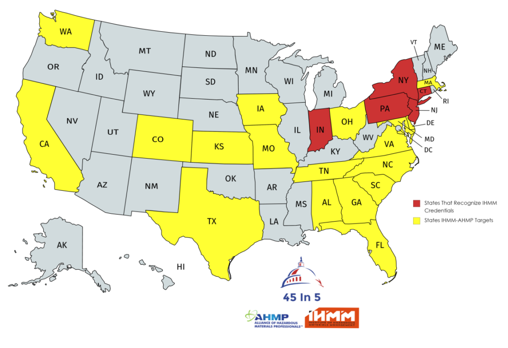 In 2019 Mark Bruce from AHMP and Gene Guilford from IHMM worked on a project to get the Commonwealth of Pennsylvania to recognize the CHMM and CDGT credentials. With Mark’s work on the ground in Pennsylvania, we succeeded. We have already succeeded in 5 states.