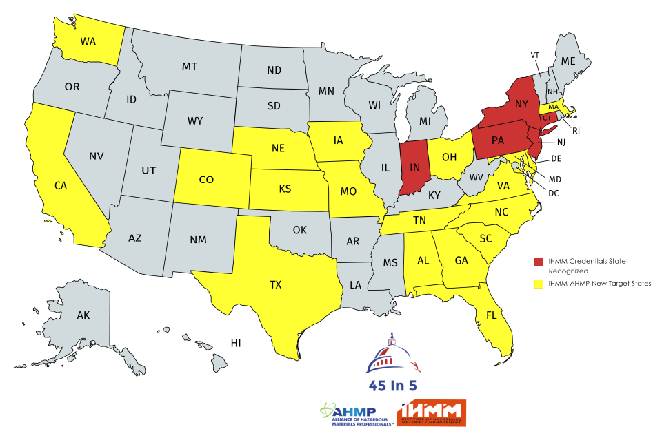 In 2019 Mark Bruce from AHMP and Gene Guilford from IHMM worked on a project to get the Commonwealth of Pennsylvania to recognize the CHMM and CDGT credentials. With Mark’s work on the ground in Pennsylvania, we succeeded. We have already succeeded in 5 states.