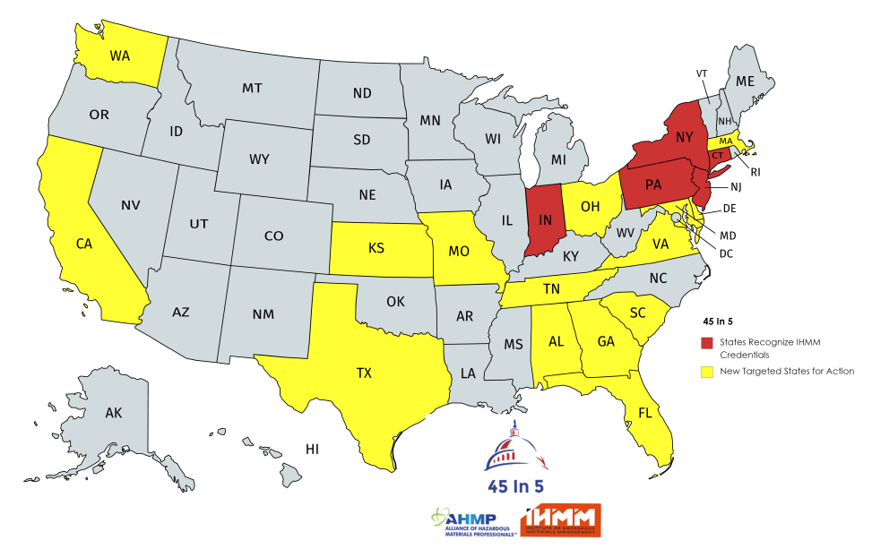 In 2019 Mark Bruce from AHMP and Gene Guilford from IHMM worked on a project to get the Commonwealth of Pennsylvania to recognize the CHMM and CDGT credentials. With Mark’s work on the ground in Pennsylvania, we succeeded. We have already succeeded in 5 states.