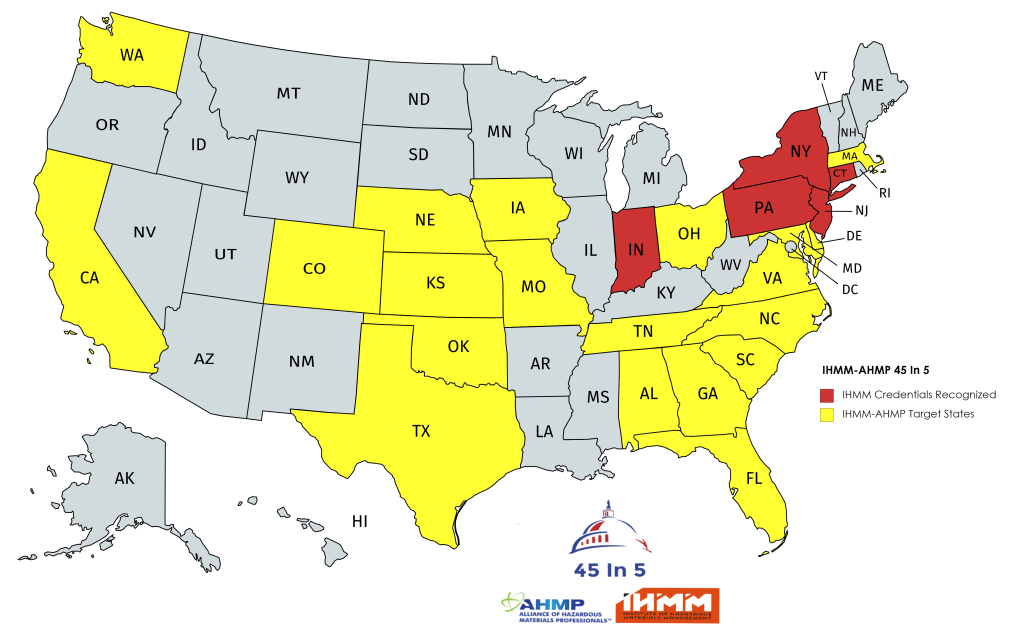 In 2019 Mark Bruce from AHMP and Gene Guilford from IHMM worked on a project to get the Commonwealth of Pennsylvania to recognize the CHMM and CDGT credentials. With Mark’s work on the ground in Pennsylvania, we succeeded. We have already succeeded in 5 states.